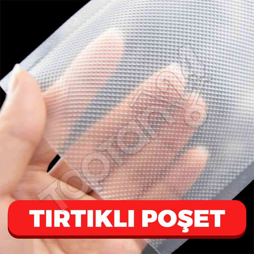 25×35 Tırtıklı Gıda Vakum Poşeti, piyasada “kanallı”, “emboss” veya “baklava desenli” poşet olarak da bilinir. Bir yüzeyi düz, diğer yüzeyi ise özel dokulu (gofrajlı) olan bu ambalajın temel amacı, harici vakum makinelerinin havayı poşet içerisinden kesintisiz bir şekilde tahliye edebilmesini sağlamaktır. Düz poşetlerin aksine, bu tırtıklı kanallar vakum sırasında poşet yüzeylerinin birbirine yapışıp hava yolunu kapatmasını engeller ve içerideki tüm oksijenin dışarı atılmasına imkan tanır.