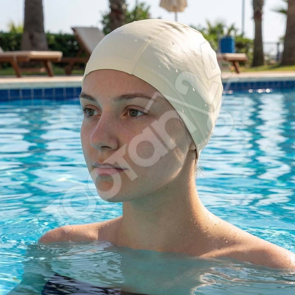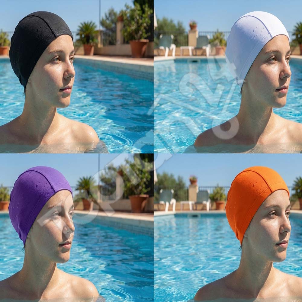 Fabric swim caps, lycra swimming caps Turkey, textile pool caps wholesale, flexible fabric swim headwear, wholesale swim caps for hotels, stretchable swimming caps, bulk swim caps Turkey, breathable swim cap, fabric cap for spa, colorful swim caps for adults, cheap swimming caps for schools.